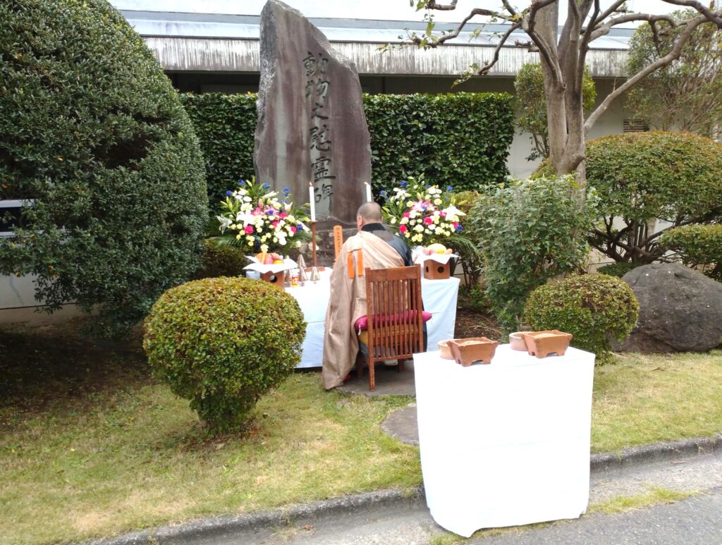動物慰霊祭は、ワクチンの研究開発、製造および品質管理に資するために使用された動物たちの尊い命に対し、深い感謝の念を捧げ、御霊の冥福を祈る儀式です。当日は動物慰霊碑の前に多くの所社員が参列し、住職の読経のもと、焼香を通じて動物たちへの鎮魂と感謝の気持ちを捧げました。