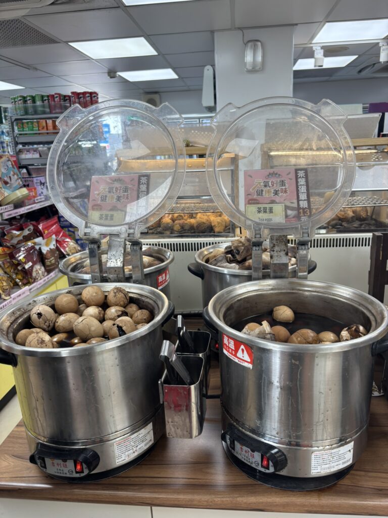 写真左はコンビニで必ず見かける「茶葉蛋(チャーイエダン)」。「蛋」は「卵🥚」の意味です~。「蚤」とお間違えなきよう😊(私は最初間違えた…)。茶葉と種々の香辛料の中で殻ごと煮詰められており、ポットの中で温められています(味が染み込むようにあえて殻は割られています)。コンビニに入ると匂う独特の香りはこのポットからのもの。以外とあっさりした固ゆで卵なので、それほど抵抗なく食べられると思います。