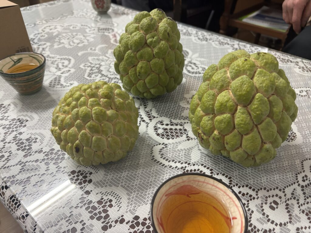 写真右は「釈迦頭(シャカトウ)」と呼ばれるバンレイシ科の果物。ちょうど冬が旬ということでお目にかかる事ができました。日本でもアテモヤなど、同等の果物を見かけたことがあるかもしれません。見た目がお釈迦様のアタマに酷似しているのでそのままの名前がついています👷♀️。見た目に反して、完熟した釈迦頭は濃厚でとっても甘く、冷やして食べると今までにない味わいにハマるかもしれませんよ🍊。