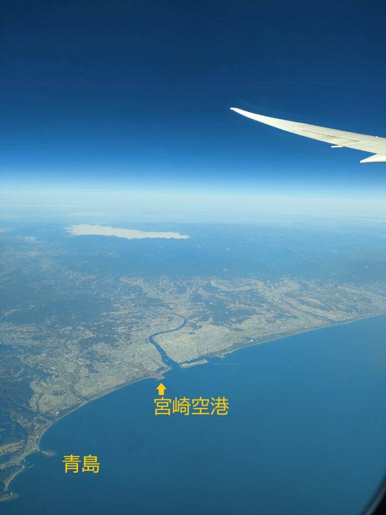 写真左は鹿児島県です。上空から見ると桜島と火山灰の様子が一目瞭然で、鹿児島市、姶良市、垂水市も一望できました。写真右は宮崎市です。宮崎空港がはっきりと見えます。
