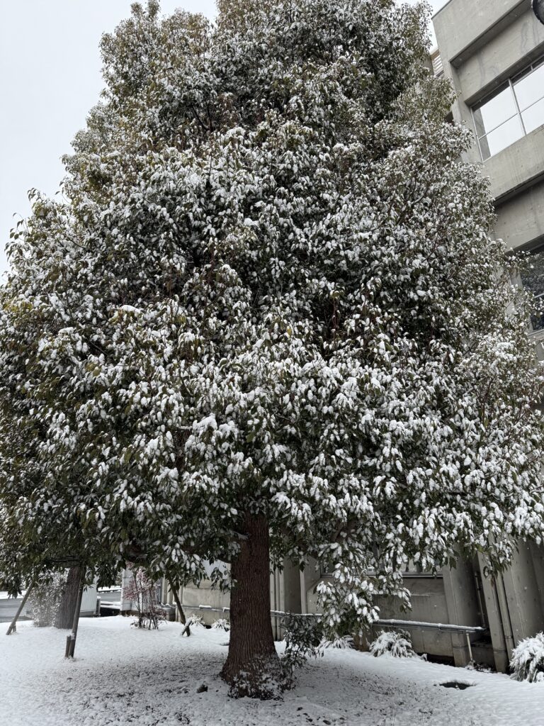 前日の雪が残っていて、社内の植木もきれいに雪化粧をしていました。