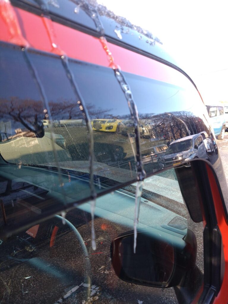 8日の積雪の様子と、9日の朝に車についたつららの写真です。